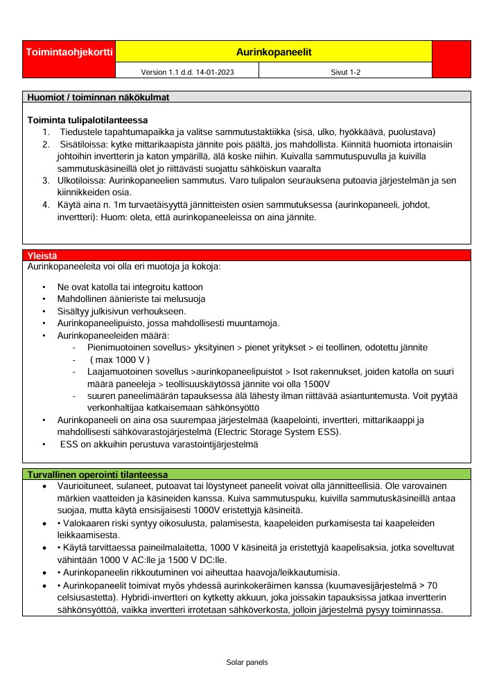 Toimintaohjekortti aurinkopaneelien onnettomuustilanteita varten
